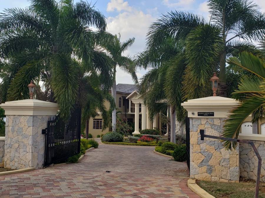 Villa For Sale: Elegantly tucked into the lush Jamaican landscape of the exclusive gated community of The Greens, Rose Hall, St. James is the beautiful Golden Castle Villa (Hotel on the Greens). Boasting 12 spacious bedrooms with en suite bathrooms, 2 powder rooms + full staff quarters. Enjoy breathtaking views of the Caribbean Sea, access to Doctor's Cave Beach and the Cinnamon Hill Golf Course right at your doorstep. The villa's private amenities rival those of any resort, from the state-of-the-art home theatre that comfortably seats 24, large conference room, games rooms (with billiards, darts, etc.) & mini bar, fitness centre, spa & sauna facilities. Soak in the Caribbean sun from the poolside and hot tub, outdoor living areas featuring barbeque pit and open bar…Just relax and enjoy!